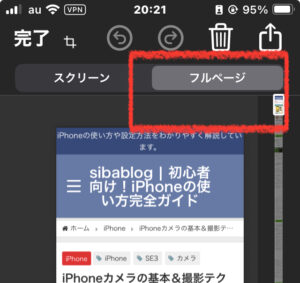 SafariでWebページをスクショすると、画面下に「フルページ」タブが表示
